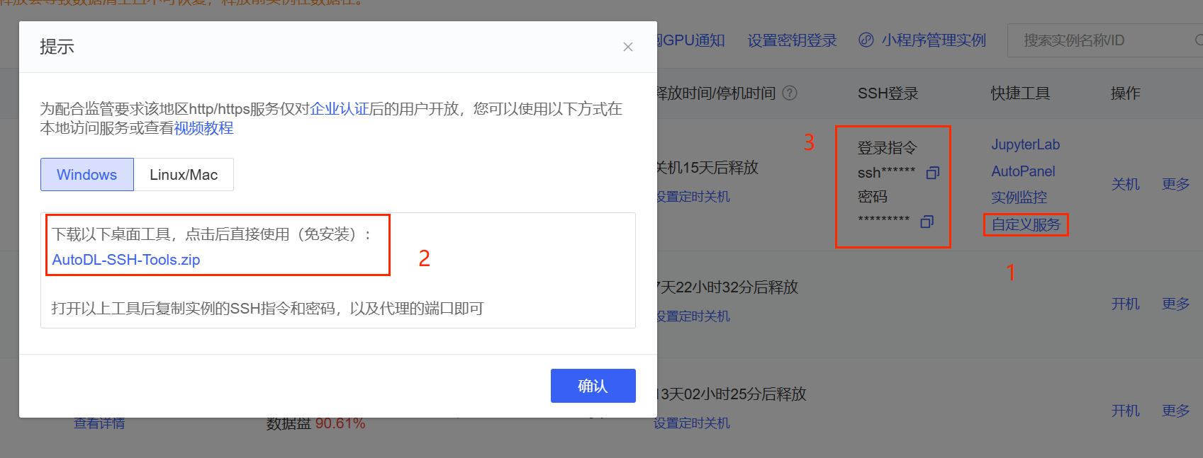 最后,开放端口,使其能被远程访问。笔者使用的是AutoDL租用的服务器操作,远程连接方法如下图