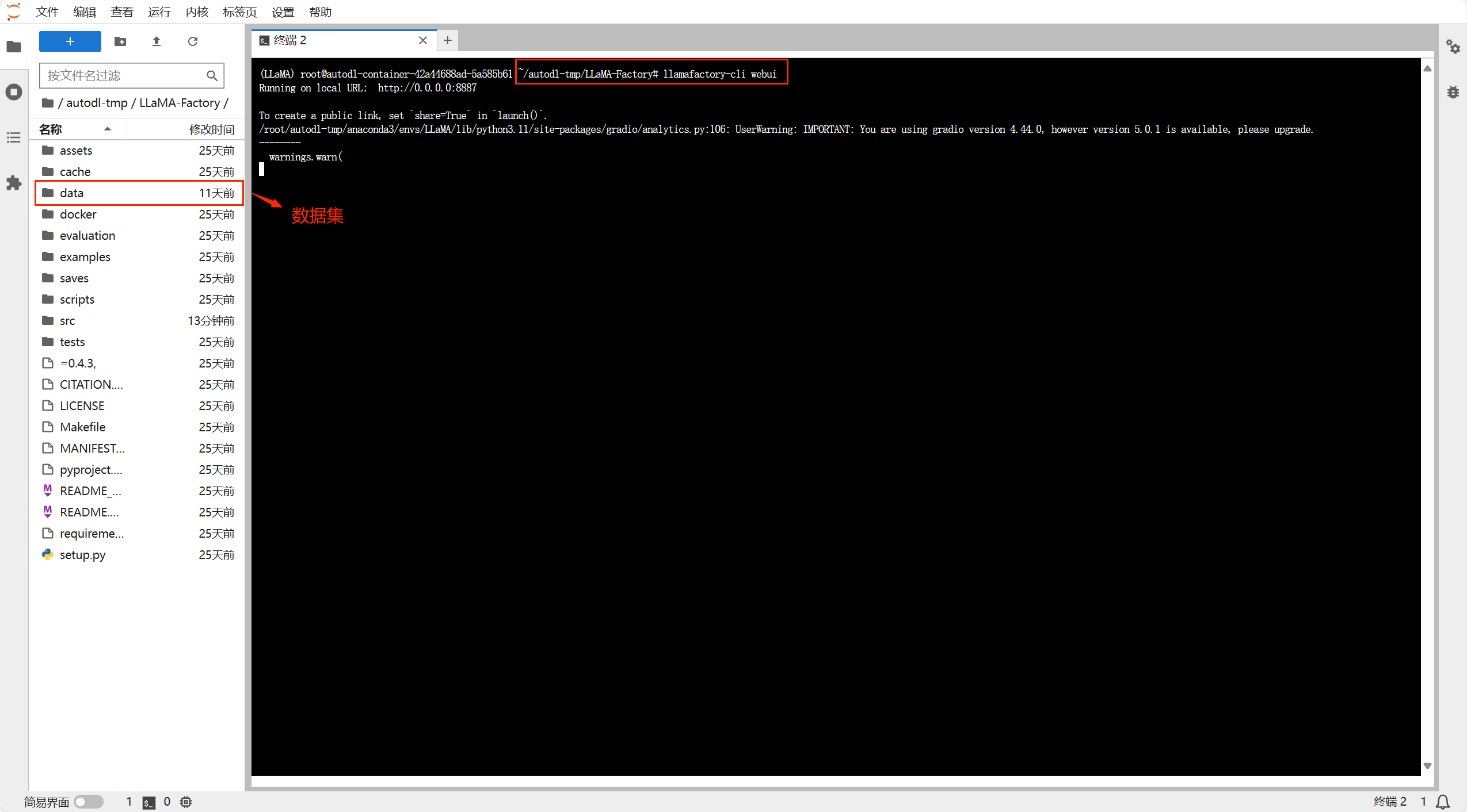 然后,切换到LLaMA-Factory这个目录,运行以下命令(一定要在LLaMA-Factory路径下运行以下命令,否则找不到对应的数据集)