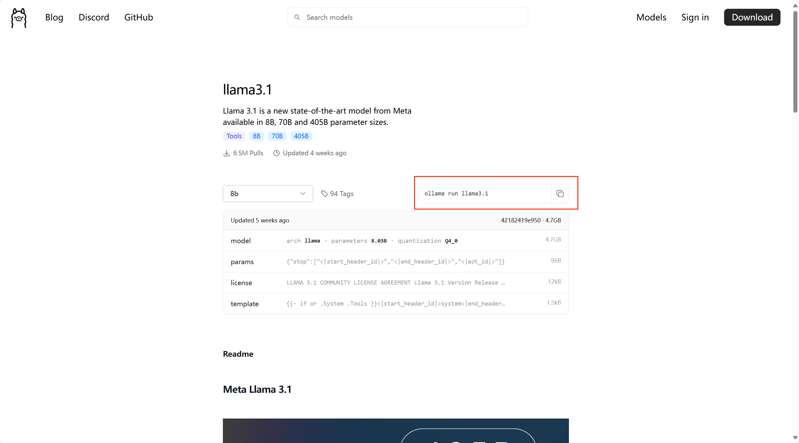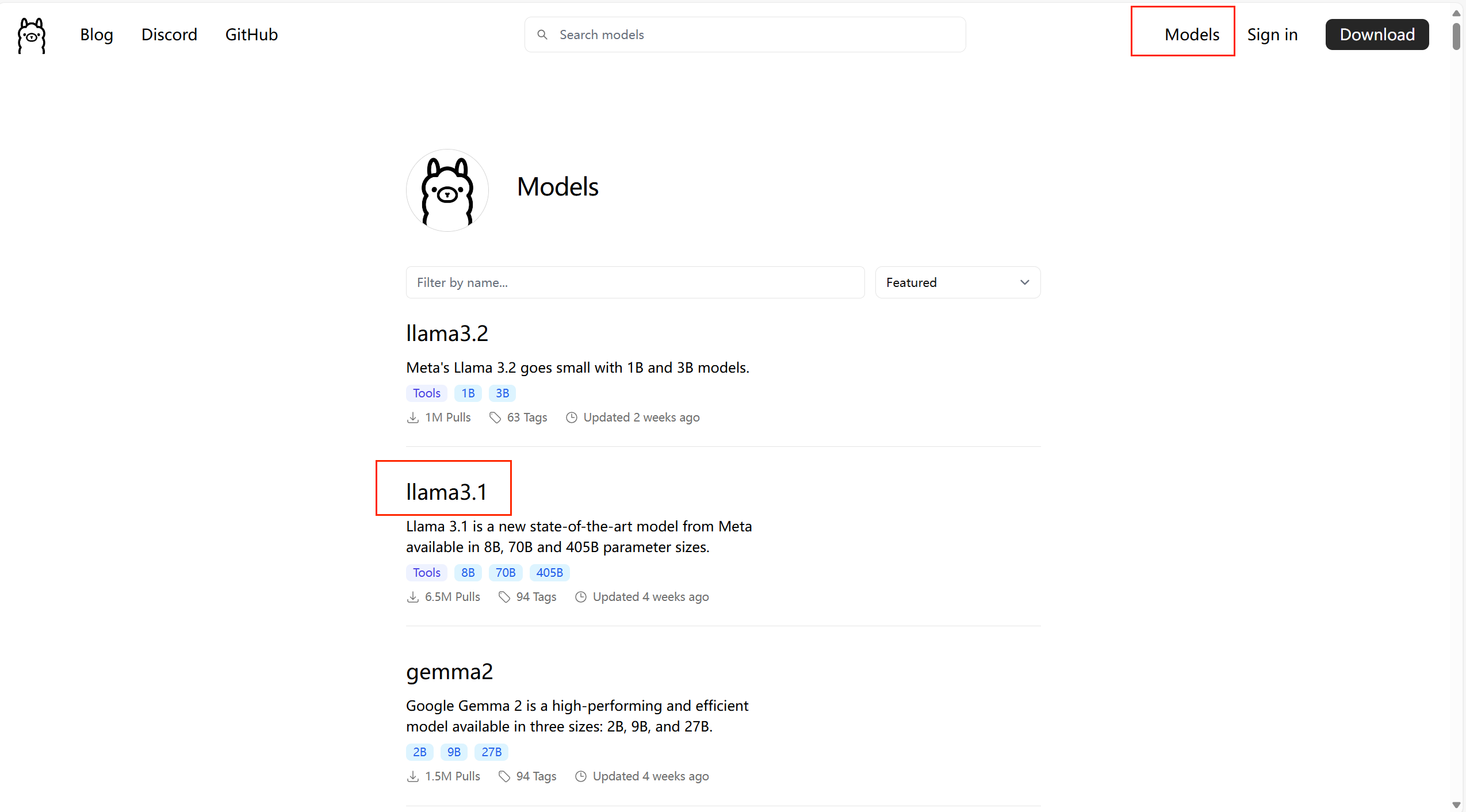 可以看到ollama提供非常多种类的模型,这里我们选择llama3.1(读者可以自行尝试其他模型,使用方法一致)