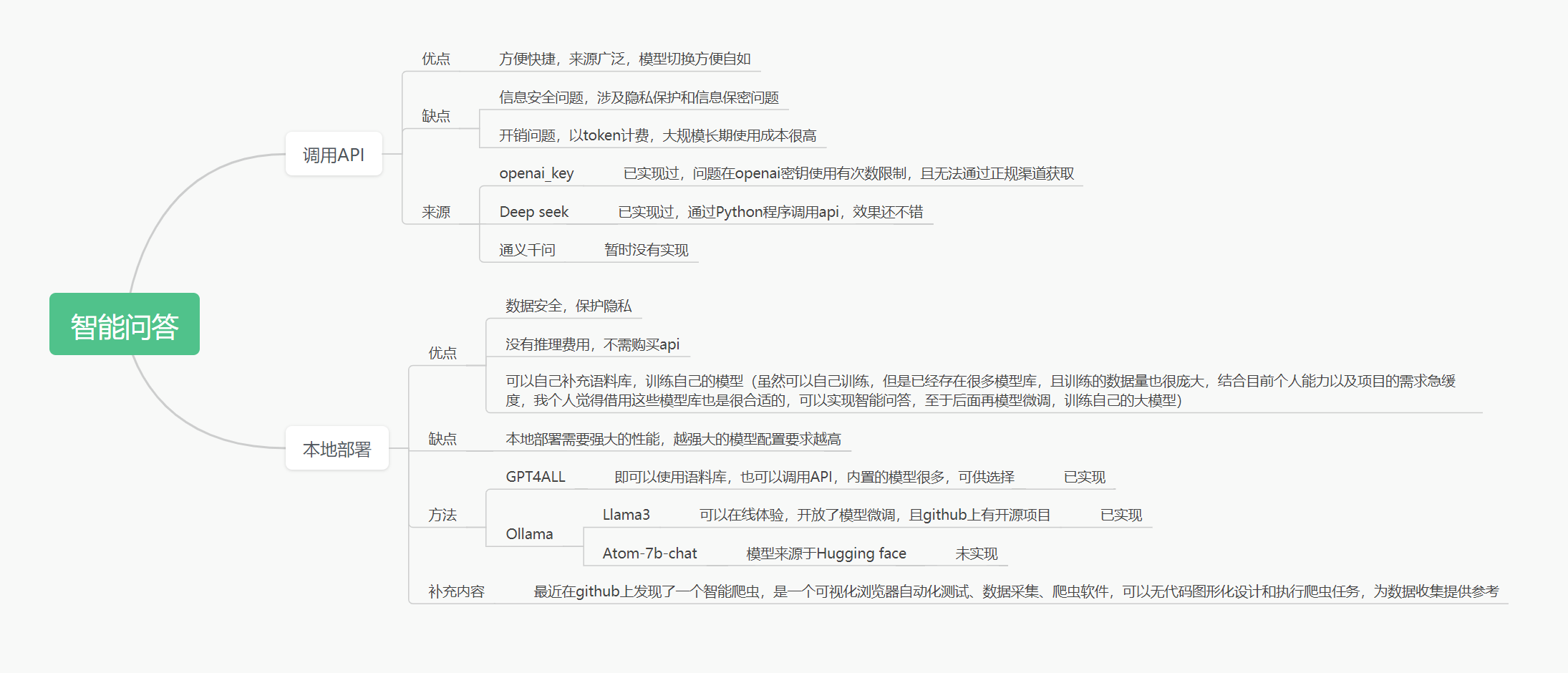 前期调研智能答疑系统实现的技术路线,提出两种解决方案,一种是直接调用API,一种是本地部署大模型